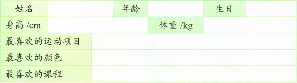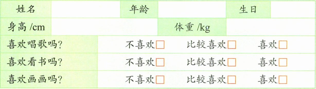 | 喜欢唱歌吗? | 不喜欢□ | 比较喜欢□ | 喜欢□ | | |