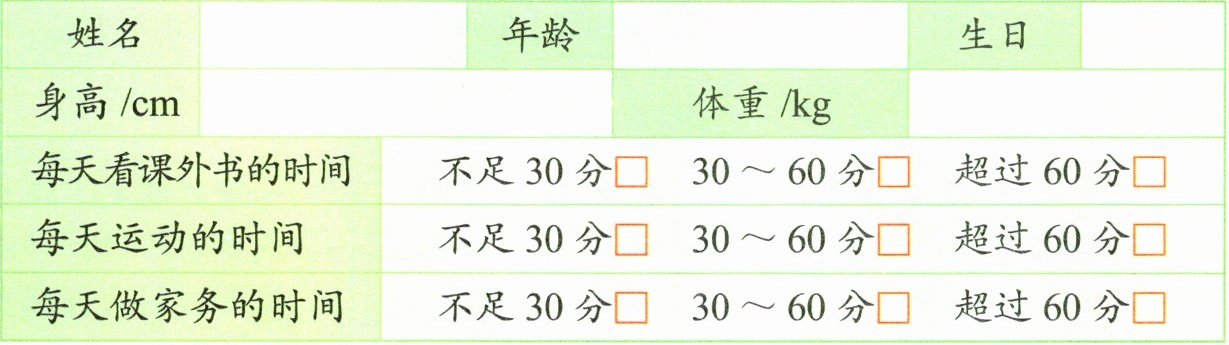 | 每天看课外书的时间 | 不足30分□ | 30~60分□ | 超过60分□ | | |