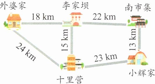 小辉家→十里营→李家坝→外婆家:23+15+18=56(千米);小辉家→南市集→李家坝→外婆家:13+22+18=53(千米);小辉家→十里营→外婆家:24千米。24<53<56,走小辉家→十里营→外婆家最近,最近是24千米。