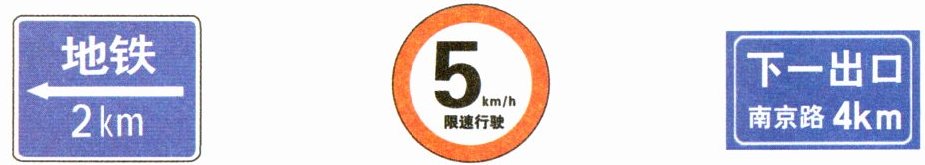 1. 第一个标志表示距离地铁还有2千米;第二个标志表示限速5千米每小时;第三个标志表示距离下一出口南京路还有4千米。见过的含有“km”的标志还有高速公路上的距离指示牌(如“距XX出口50km”)等。