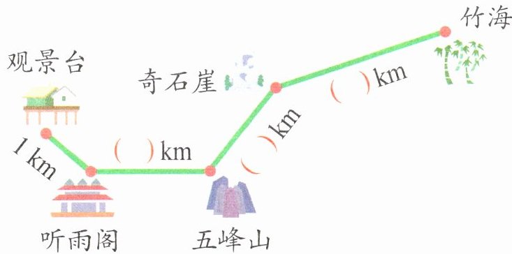 观景台到听雨阁的路程大约是 1 千米。听雨阁到五峰山、五峰山到奇石崖、奇石崖到竹海的路程大约各是多少千米?估一估,填一填。