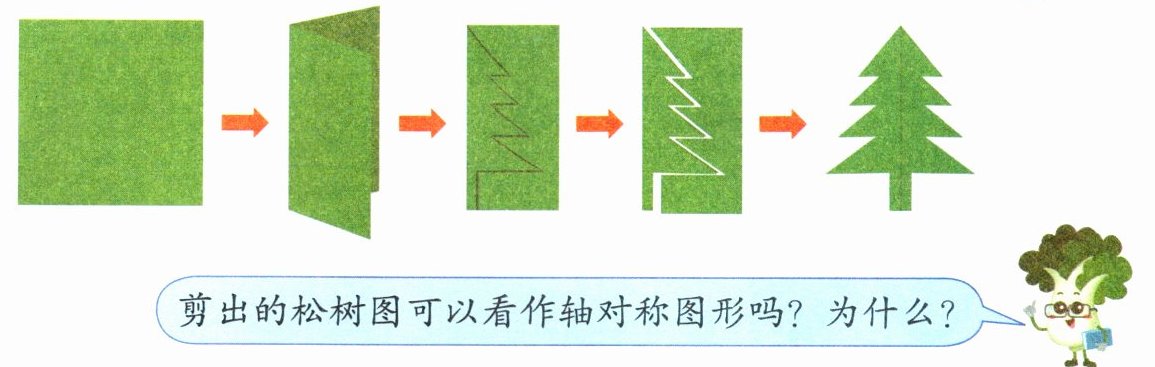 答案:将一张彩纸对折,在对折后的彩纸上画出松树图一半的形状,然后沿着画好的线剪下来,展开后就得到了右边的松树图。