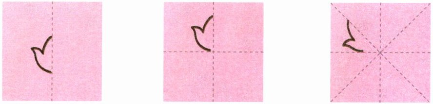 3. 将三张正方形彩纸照下面的样子分别对折,画上相同的图案,再剪下来,看各能剪出什么样的图案。