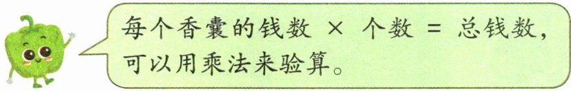 每个香囊的钱数×个数= 总钱数,可以用乘法来验算。