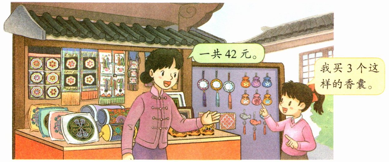 (图中对话:“一共42元。”“我买3个这样的香囊。”)