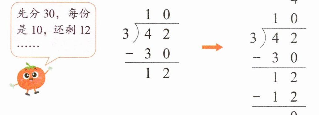 $\begin{array}{r} 10\\ 3\enclose{longdiv} {42}\\ 30\\ \hline 12\end{array} $ → $\begin{array}{r} 14\\ 3\enclose{longdiv} {42}\\ 30\\ \hline 12\\ 12\\ \hline 0\end{array} $