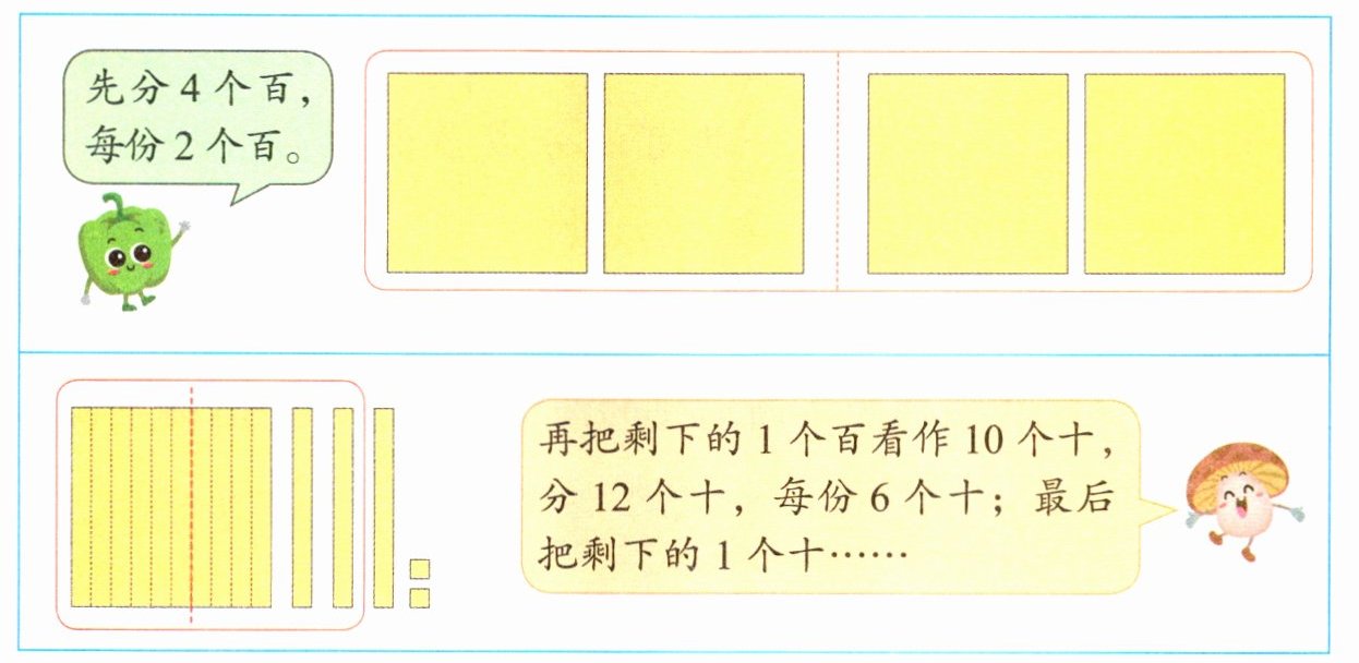 再把剩下的1个百看作10个十,分12个十,每份6个十;最后把剩下的1个十……
