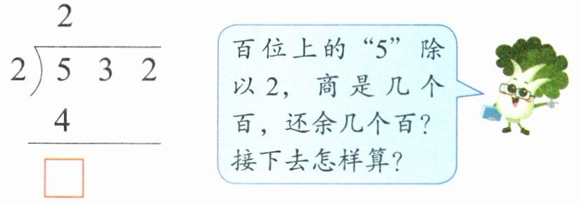 百位上的“$5$”除以$2$,商是$2$个百,还余$1$个百。