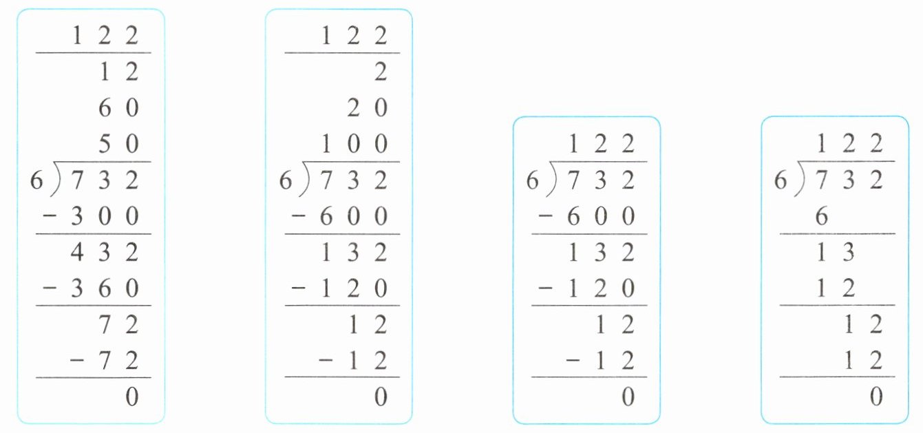 答案:这些竖式都是在计算$732÷6$,不同形式展示了逐步计算的过程,从最初的大数相减逐步简化为更简洁的计算步骤,最终得到商为$122$。