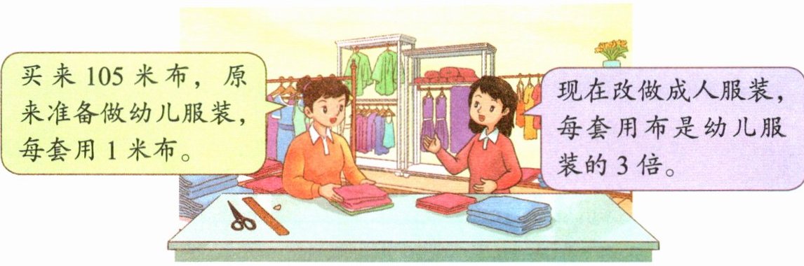 共有$105$米布,则可做成人服装的数量为$105÷3 = 35$(套)。