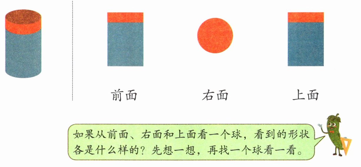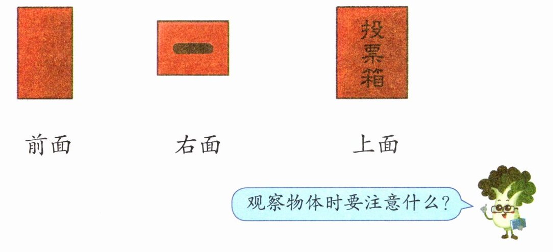 答案:从前面看投票箱,看到的是长方形形状,与第一个图形相连;从右面看投票箱,看到的是较窄的长方形形状,与第二个图形相连;从上面看投票箱,看到的是带有文字“投票箱”的长方形形状,与第三个图形相连。观察物体时要注意观察的方向和角度。