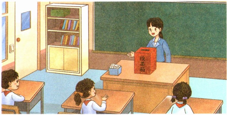 1 把投票箱放在自己面前,指一指它的前面、右面和上面。