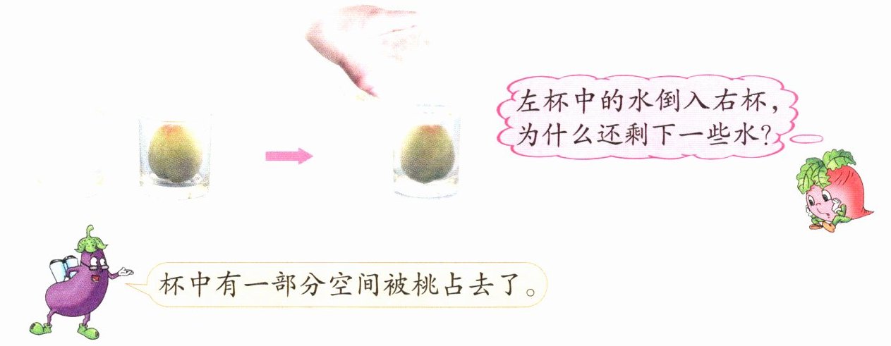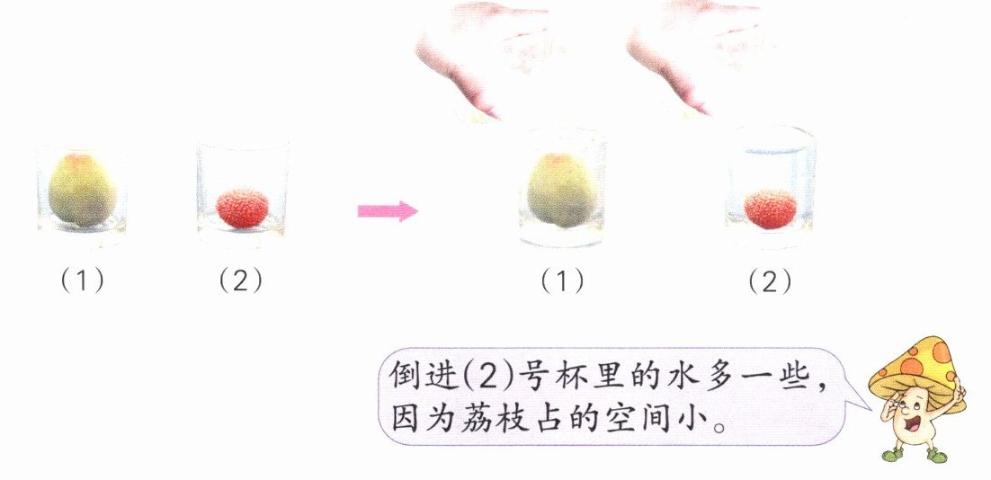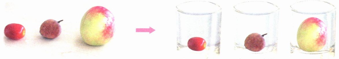 下面三个水果中,(从左到右第三个水果,即插图中最大的那个)占的空间大。如果把它们放在同样大的杯中,再倒满水,(放从左到右第一个水果,即插图中最小的那个)杯里水占的空间大。