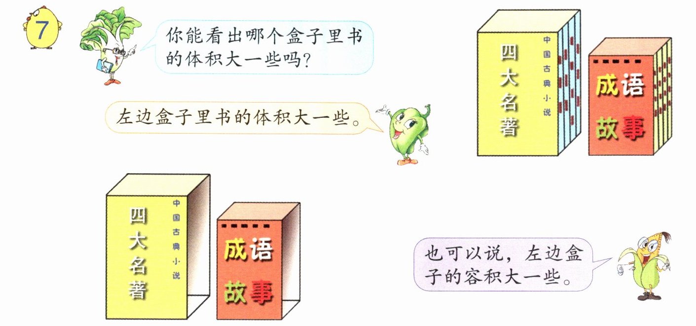 答案:左边盒子里书的体积大一些,也可以说左边盒子的容积大一些。