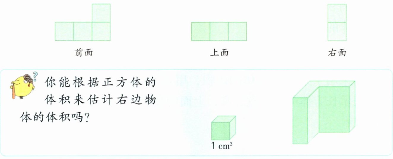 10. 小明用几个1立方厘米的正方体木块摆了一个物体。下面是从不同方向看到的图形,这个物体的体积是多少?