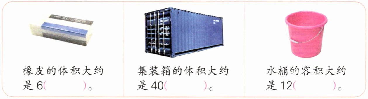 |橡皮的体积大约是6( )。|集装箱的体积大约是40( )。|水桶的容积大约是12( )。|