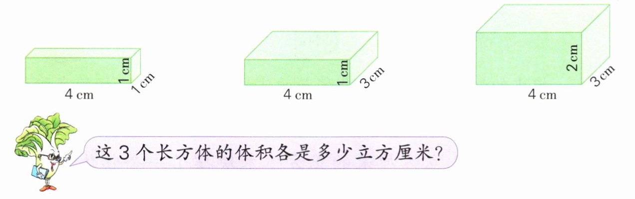 答案:第一个长方体需要 4 个 1 立方厘米的小正方体,体积是 4 立方厘米;第二个长方体需要 12 个 1 立方厘米的小正方体,体积是 12 立方厘米;第三个长方体需要 24 个 1 立方厘米的小正方体,体积是 24 立方厘米。