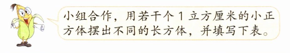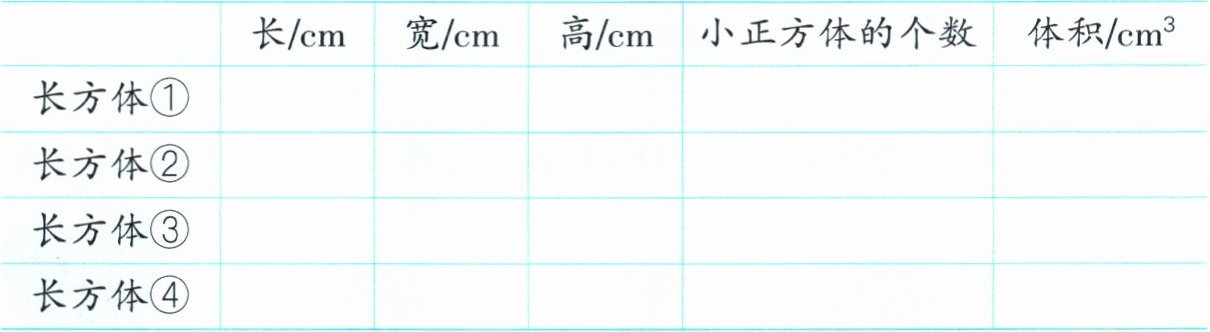 小组合作,用若干个1立方厘米的小正方体摆出不同的长方体,并填写下表。