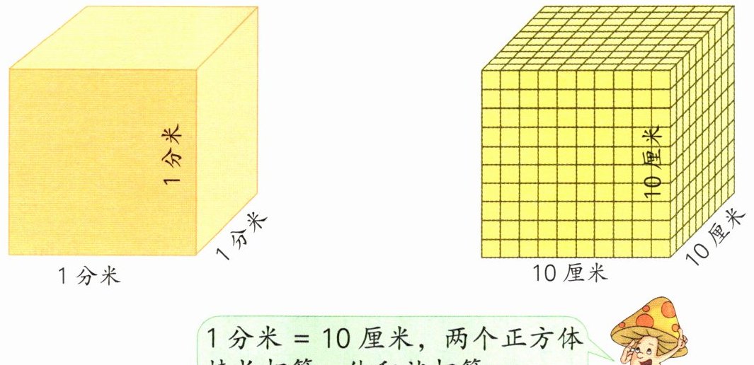 |棱长1分米的正方体,体积是1立方分米。|$10×10×10= 1000$(立方厘米)。棱长10厘米的正方体,体积是1000立方厘米。|