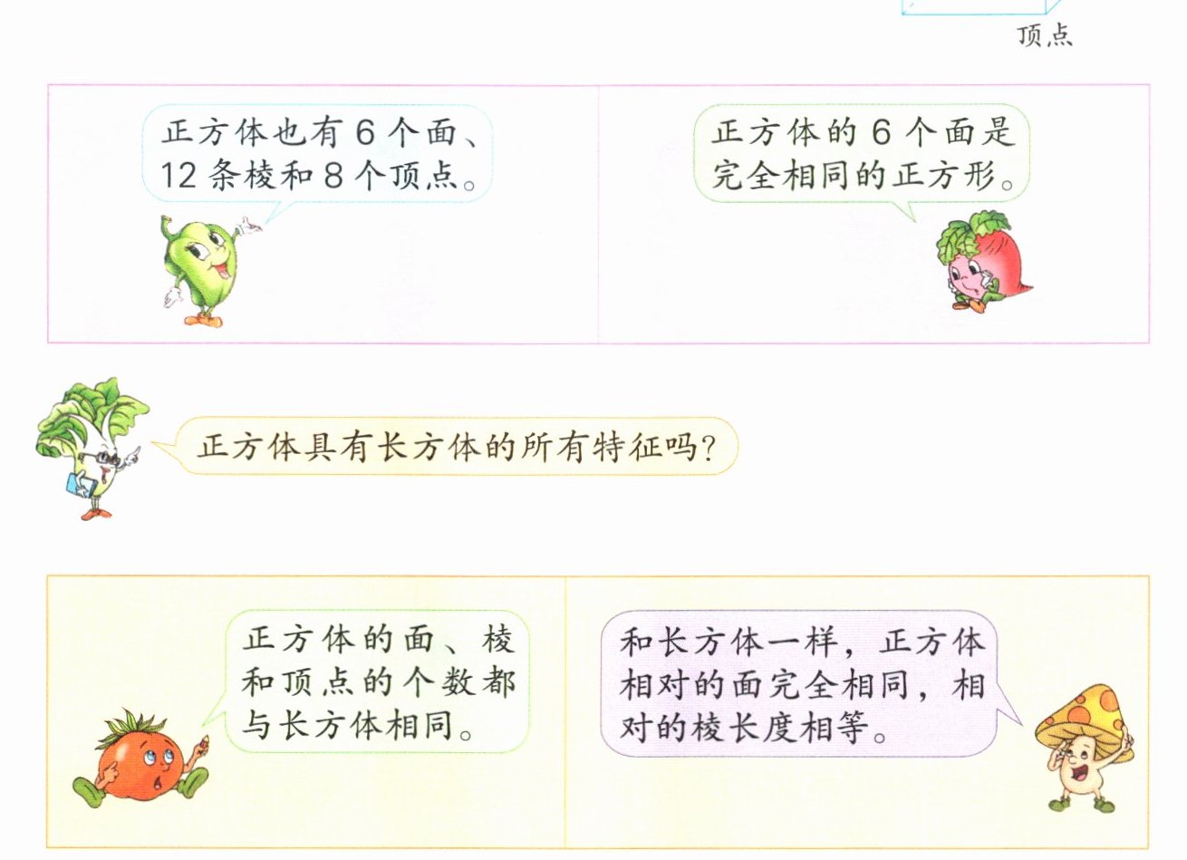 答案:正方体有6个面、12条棱和8个顶点。正方体的6个面是完全相同的正方形,12条棱长度都相等。正方体具有长方体的所有特征,是特殊的长方体。