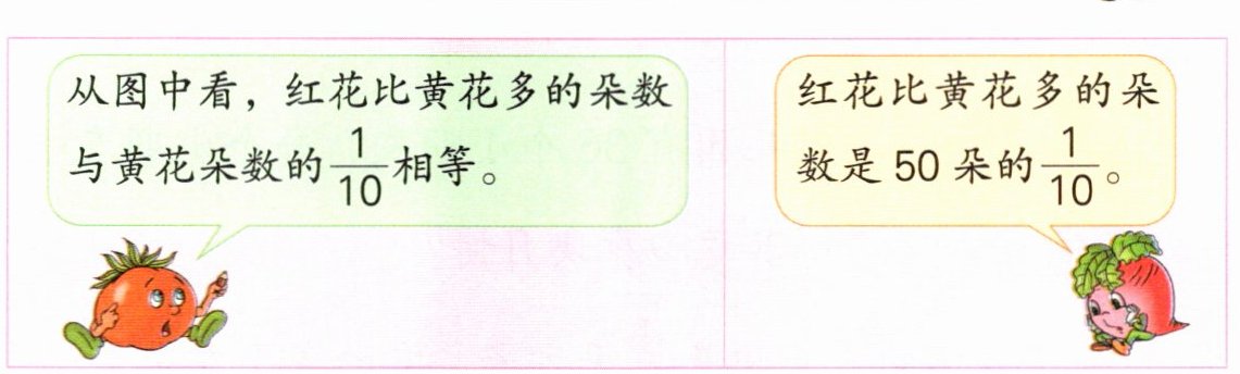 | 从图中看,红花比黄花多的朵数与黄花朵数的$\frac{1}{10}$相等。 | 红花比黄花多的朵数是50朵的$\frac{1}{10}$。 |