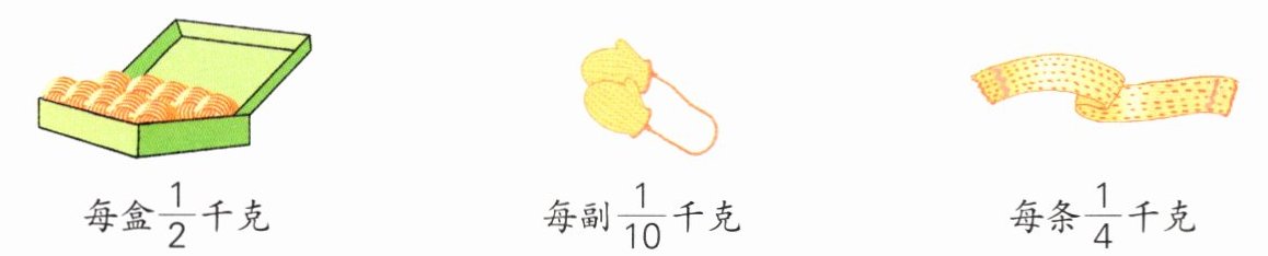 13. 每盒$\frac{1}{2}$千克 每副$\frac{1}{10}$千克 每条$\frac{1}{4}$千克 用这盒毛线能织几副手套?能织几条围巾?