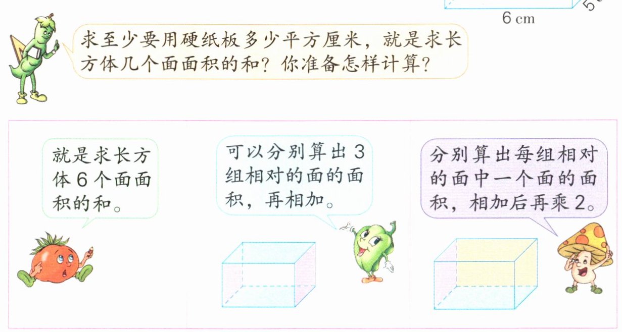 4 做一个长6厘米、宽5厘米、高4厘米的长方体纸盒,至少要用硬纸板多少平方厘米?