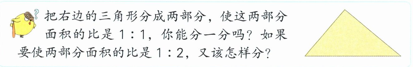 把右边的三角形分成两部分,使这两部分面积的比是1:1,你能分一分吗?如果要使两部分面积的比是1:2,又该怎样分?