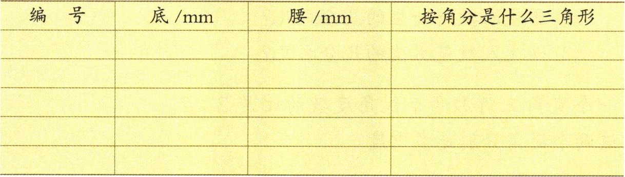 | 编 号 | 底 /mm | 腰 /mm | 按角分是什么三角形 |