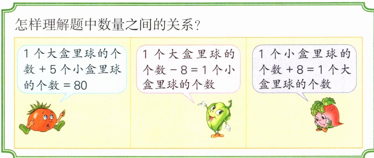 2 在1个大盒和5个同样的小盒里装满球,正好是80个。每个大盒比每个小盒多装8个,大盒里装了多少个球?每个小盒呢?