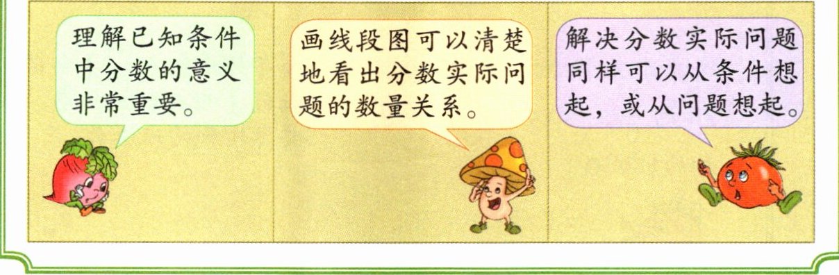 体会:理解已知条件中分数的意义非常重要;画线段图可以清楚地看出分数实际问题的数量关系;解决分数实际问题同样可以从条件想起,或从问题想起。