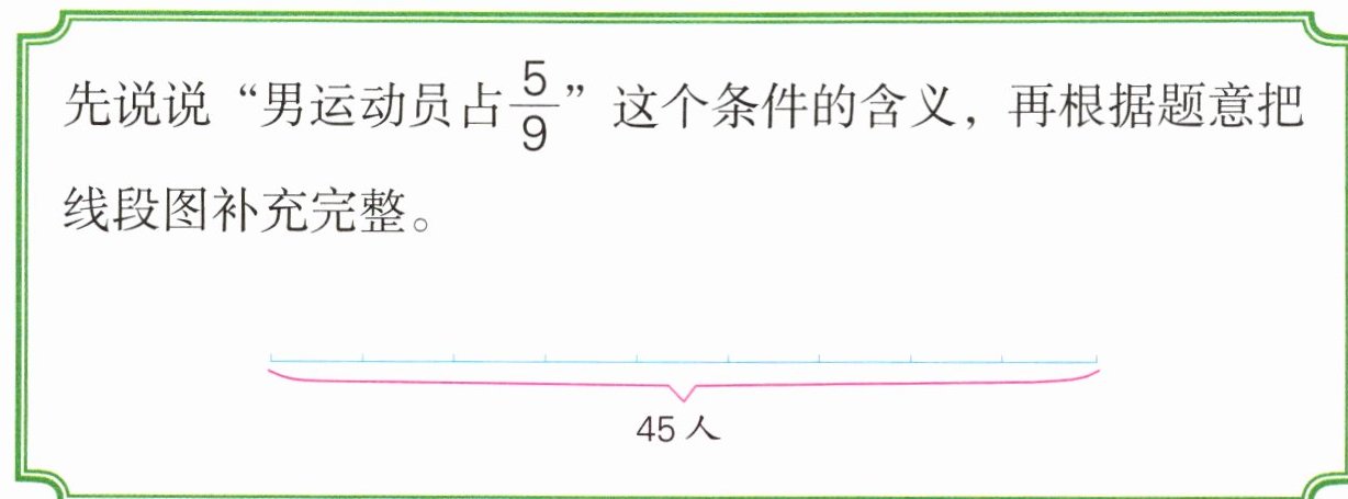 先说说“男运动员占$\frac{5}{9}$”这个条件的含义,再根据题意把线段图补充完整。
