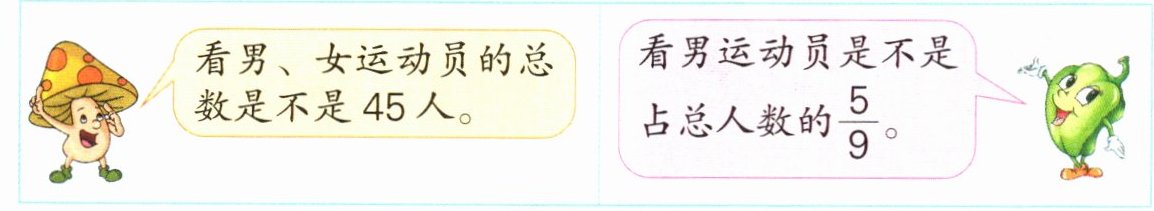 “男运动员占$\frac{5}{9}$”表示把参加运动会的45个同学看作单位“1”,平均分成9份,男运动员占其中的5份。