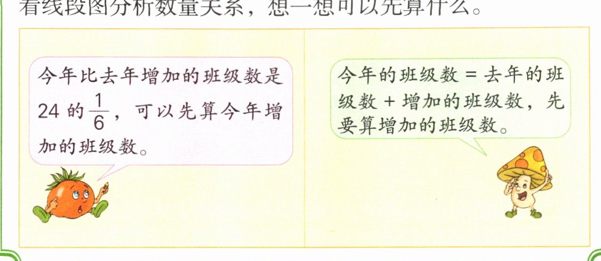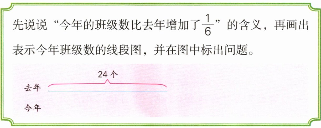先说说“今年的班级数比去年增加了$\frac{1}{6}$”的含义,再画出表示今年班级数的线段图,并在图中标出问题。