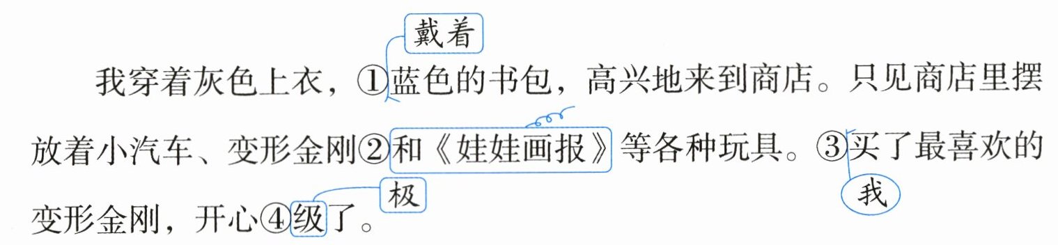 我穿着灰色上衣,$①\overset{戴着}{\text{蓝色的书包}},$高兴地来到商店。只见商店里摆放着小汽车、变形金刚$②\overset{和《娃娃画报》}{\text{、}}$等各种玩具。$③\overset{买了}{\text{我}}$最喜欢的变形金刚,开心$④\overset{级了}{\text{极}}。$