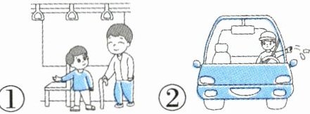示例:① 小男孩给老爷爷让座,这是尊老的表现,我们应该向他学习。②(或:③) 不能在开车时往车外扔垃圾,这样容易导致交通事故,还会破坏环境。(或:水资源有限,人人都应该节约用水,像图中这样不及时关闭水龙头会造成水资源的浪费。)