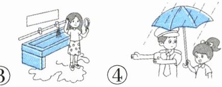 婷婷:老师,我先来! 图④中的女孩给在雨中执勤的交警叔叔撑伞,她做得很棒,我们应该向她学习!