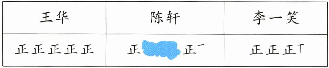 3. 新趋势 算理理解 二(2)班在选班长,下面是班主任用画“正”字的方法记录的每个竞选人的得票情况。(一画表示1票)