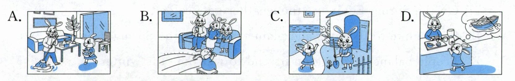 3. 第三段对话“Do you want to go boating, Nana? —That's nice, but I'm making juice(果汁). I need some help. —I can help!”,主要活动是奶奶在做果汁,孩子帮忙,D选项图片中有做果汁的场景,所以3对应D。