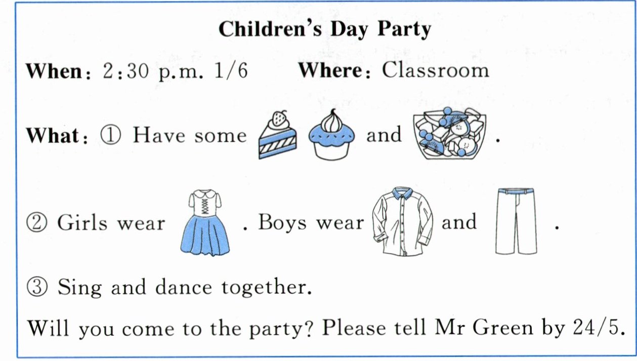 )1. The Children's Day party will start(开始) at 2:30 p.m.(