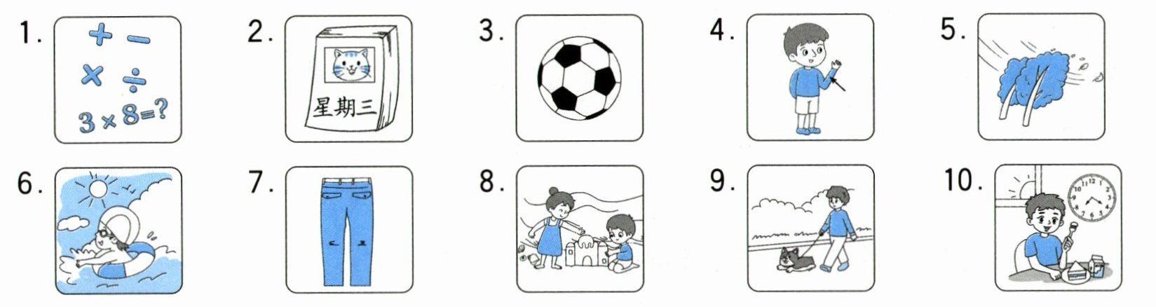 1. Maths 2. Wednesday 3. football 4. arms 5. windy 6. swimming 7. trousers 8. summer 9. walk;dog 10. have breakfast