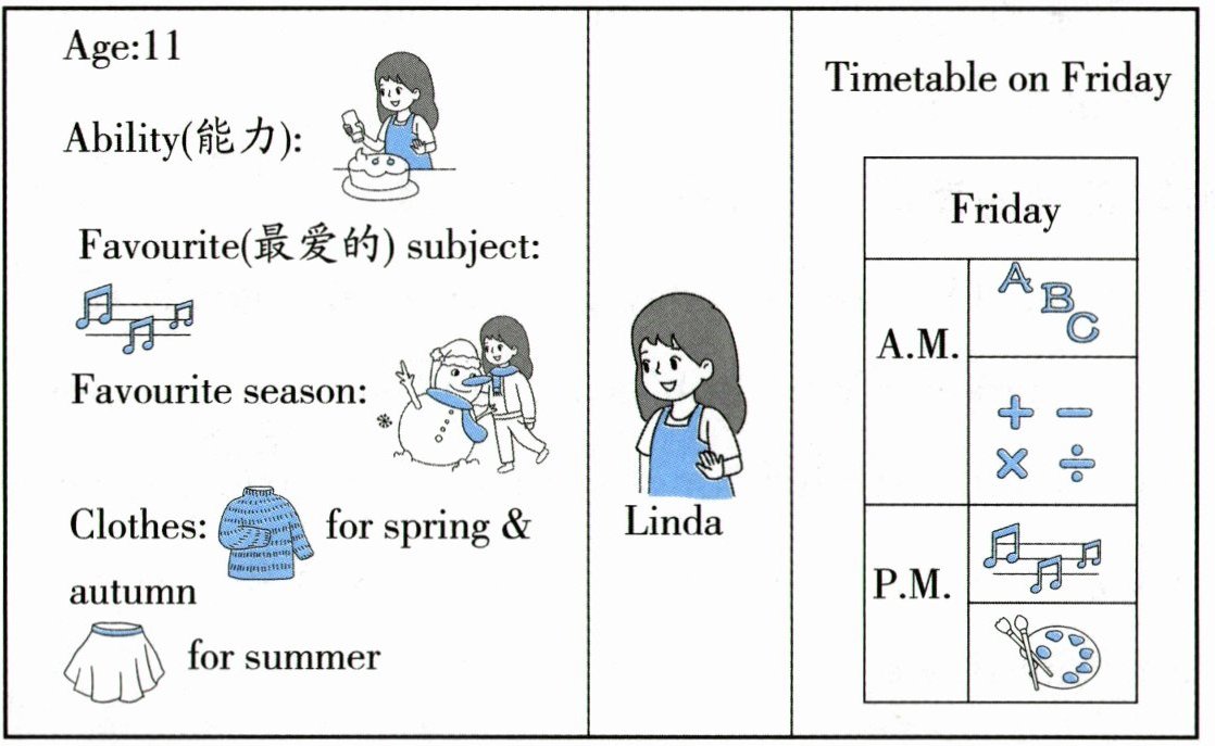 六 新语篇 统计图表 根据信息表的提示,帮助 Linda 回答 Yang Ling 的问题。