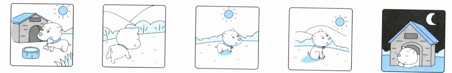 第一幅图小狗在房子旁吃早饭,对应B选项“The sun rises in the morning. The dog has breakfast.”;