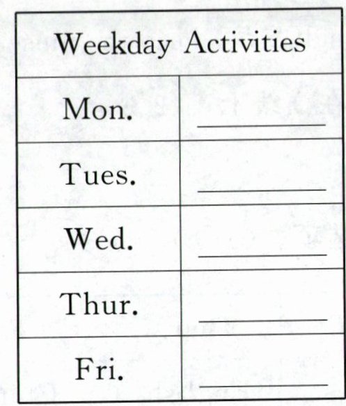 1, week 2. Tuesday 3. early; every 4. cinema 5. at six thirty 6. be late for school7. two dancing lessons 8. walk your dog