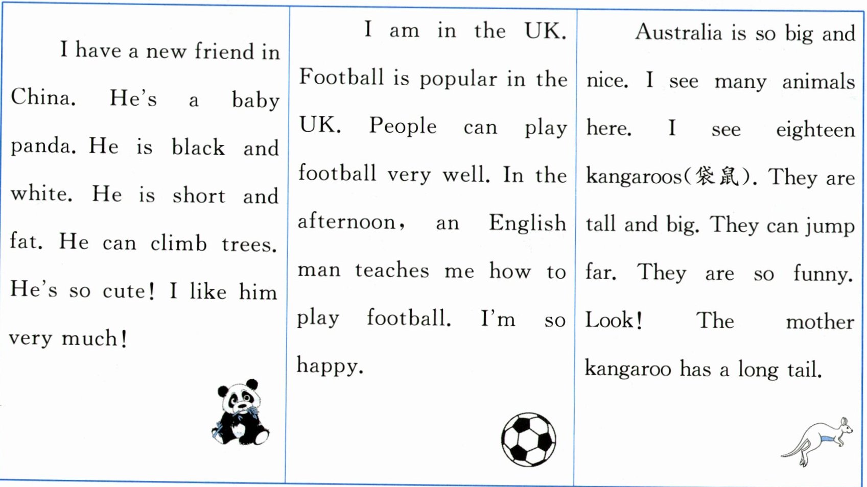 3. 第三题问的是袋鼠来自哪里,根据手账中“Australia is so big and nice. I see many animals here. I see eighteen kangaroos(袋鼠).”可知,袋鼠来自澳大利亚,所以选C。