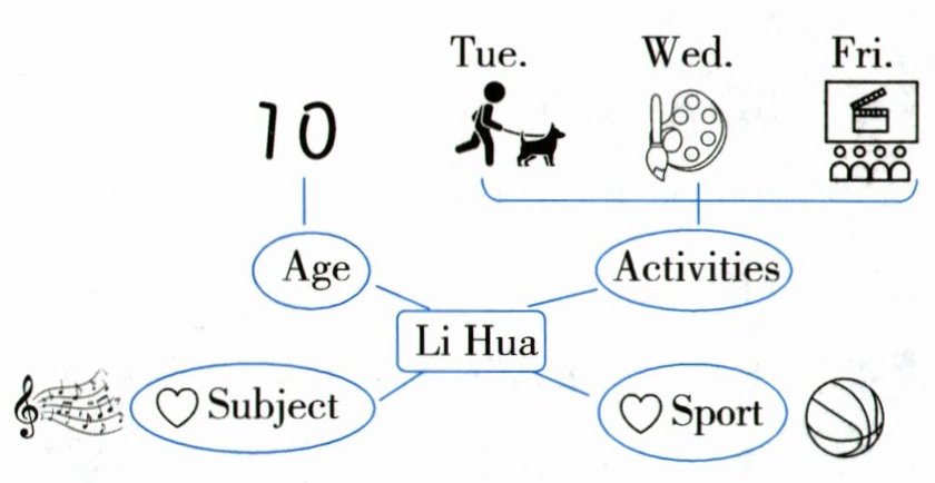 参考表达:Hello, I'm Li Hua. I'm ten. I go to school from Monday to Friday. I like Music best. After school,I plan some activities. On Tuesday,I walk the dog. On Wednesday,I draw pictures. And on Friday evening,I go to the cinema with my family. I also do sport in my free time. It's good for us. I like playing basketball.