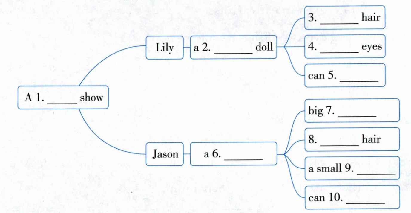 1. toy 2. lovely 3. long 4. blue 5. dance 6. robot 7. ears 8. short 9. mouth 10. talk