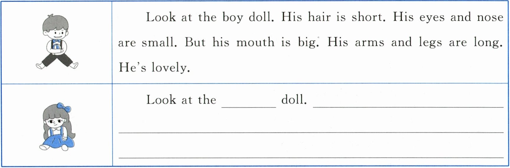 参考表达:Look at the girl doll. Her hair is long. Her eyes and face are big. But her ears are small. Her arms are short. She's beautiful/nice.