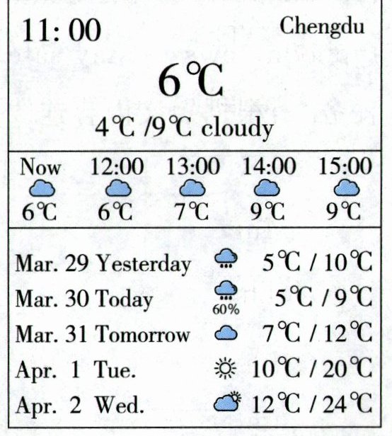 )3. It's 11:00 in the morning. It's cloudy now.(