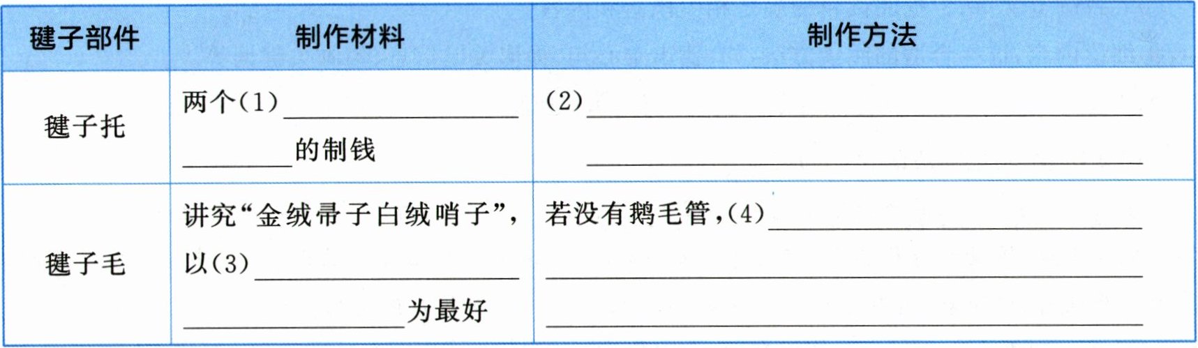 1. 第①自然段详细介绍了制作毽子的过程。请结合文章内容,将表格补充完整。(4 分)